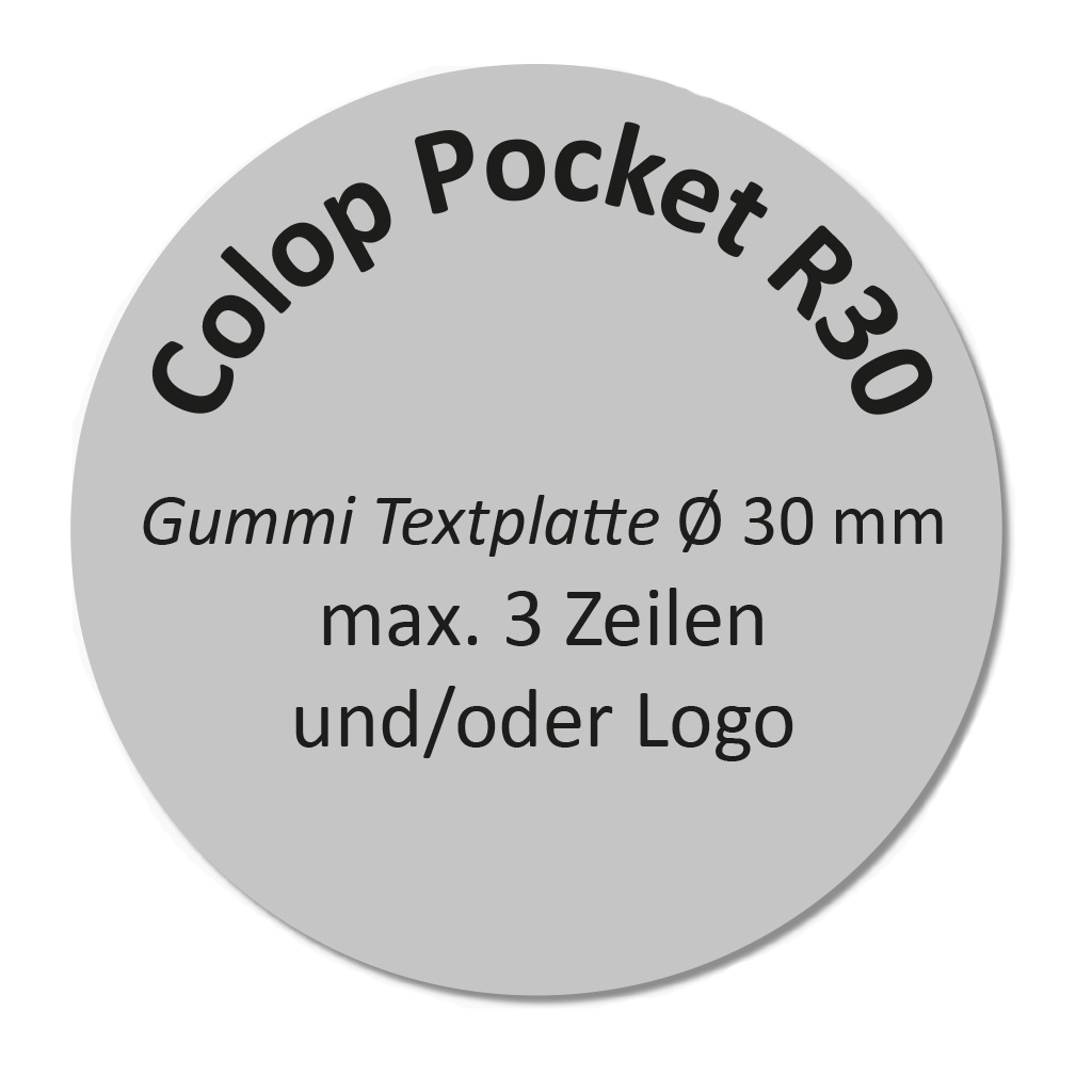 Textplatte für Colop Pocket Stempel R30 mit max. Abdruckgröße Ø 30 mm.