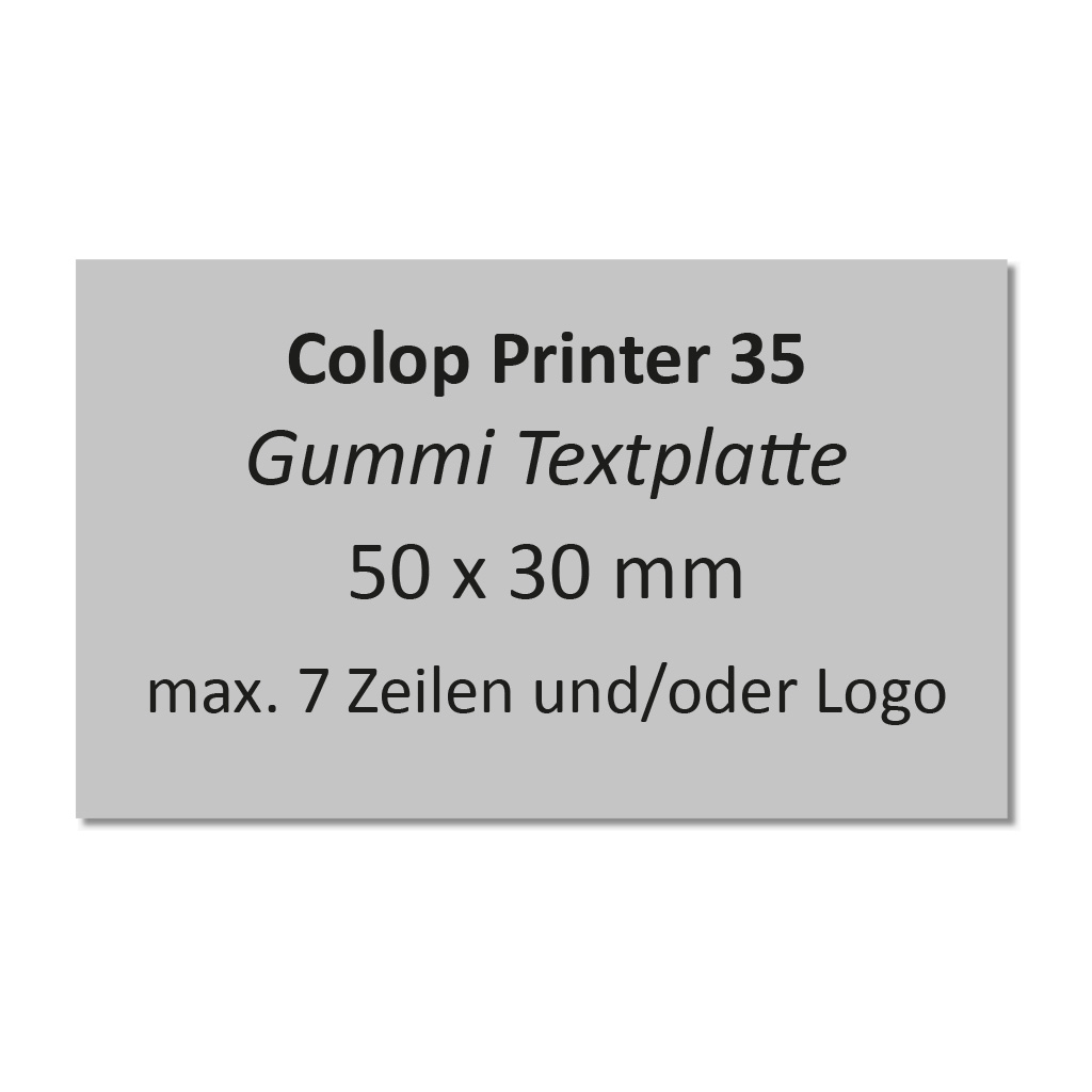 Stempelplatte mit maximaler Größe 50x30 mm. Für Colop Printer 35. Wenn Ihre alte Textplatte nicht mehr stimmt, ziehen Sie sie vom Stempel ab und ersetzen sie durch eine neue Stempelplatte. Drücken Sie die Stempel 1 mm ein, und drücken Sie die Knöpfe an der Seite, um das Ganze zu verriegeln. Die Textplatte lässt sich dann leicht entfernen.